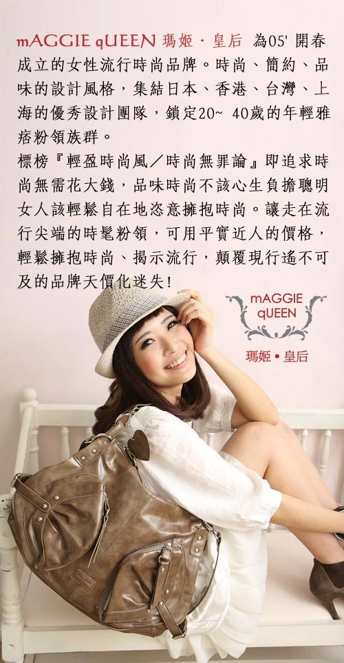 「mAGGIE qUEEN 瑪姬‧皇后」設計師時尚女包為05'開春成立的女性流行時尚品牌。時尚、簡約、品味的設計風格,集結日本、香港、台灣、上海的優秀設計團隊,鎖定 20~40 歲的年輕雅痞粉領族群。品牌宗旨:『輕盈時尚風/時尚無罪論』──即追求時尚無需花大錢;品味時尚不該心生負擔,聰明女人該輕鬆自在地恣意擁抱時尚。讓走在流行尖端的時髦粉領,可用平實近人的價格,輕鬆擁抱時尚、創造流行,顛覆現行遙不可及的品牌天價化迷失!